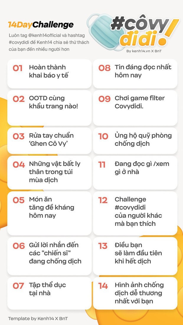 Ngay từ khi phát động, chiến dịch đã vấn đông đảo các bạn trẻ, loạt KOLs đình đám và rất nhiều các nghệ sĩ của Vbiz Việt. gồm 14 thử thách thực hành liên tục trong 14 ngày xoay quanh những vấn đề được quan tâm trong mùa dịch như: Ăn gì, khai báo y tế, rửa tay,... Và trong hơn 1 tuần nay, bằng việc hoàn tất các thử thách một cách xuất sắc, chắc hẳn chúng ta đã trang bị được kha khá kiến thức buồng dịch nữa đấy!